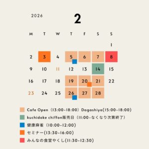 2026/02/17 いつもご利用ありがとうございます。2月の営業日のお知らせです。 月に一度のシフォンロールケーキ販売日は2月14日(土)11:00〜 となっております。 ■ 店舗情報 📍 広島市佐伯区薬師ヶ丘2-7-9(Googleマップで「薬師が丘Cafe」と検索) 営業日:木曜日〜土曜日(不定休)営業時間:13:00〜18:00 【Cafeメニュー】・コーヒー/紅茶 500円・ハーブティー 500円 皆さまのご来店を心よりお待ちしております。